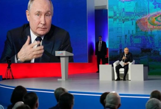 Dans un hall d’exposition situé en face du Kremlin, Vladimir Poutine entre en scène. Il est applaudi à tout rompre, ovationné. Rien d’étonnant