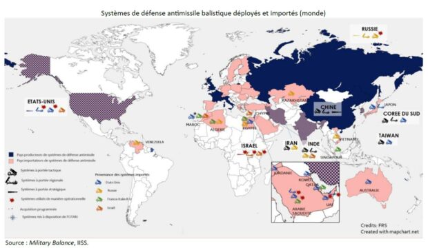 Une quarantaine de pays déploient à ce jour des systèmes défensifs. Les États-Unis, la Russie, la Chine et Israël sont les seuls États à avoir développé des systèmes couvrant toute la gamme, de l’interception terminale à courte portée à l’engagement exo-atmosphérique avec des missiles intercontinentaux. Avec la vente d’Arrow 3 à l’Allemagne, Israël est devenu le premier exportateur de ce type de systèmes d’armes défensives stratégiques. Au niveau régional, les technologies les plus répandues sont américaines : le THAAD, basé au sol, et l’AEGIS, déployé en mer. Ces systèmes et leurs variantes sont notamment déployés en Corée du Sud, au Japon, en Espagne, en Pologne, en Roumanie et au Moyen-Orient (Arabie saoudite, Émirats arabes unis et Israël).